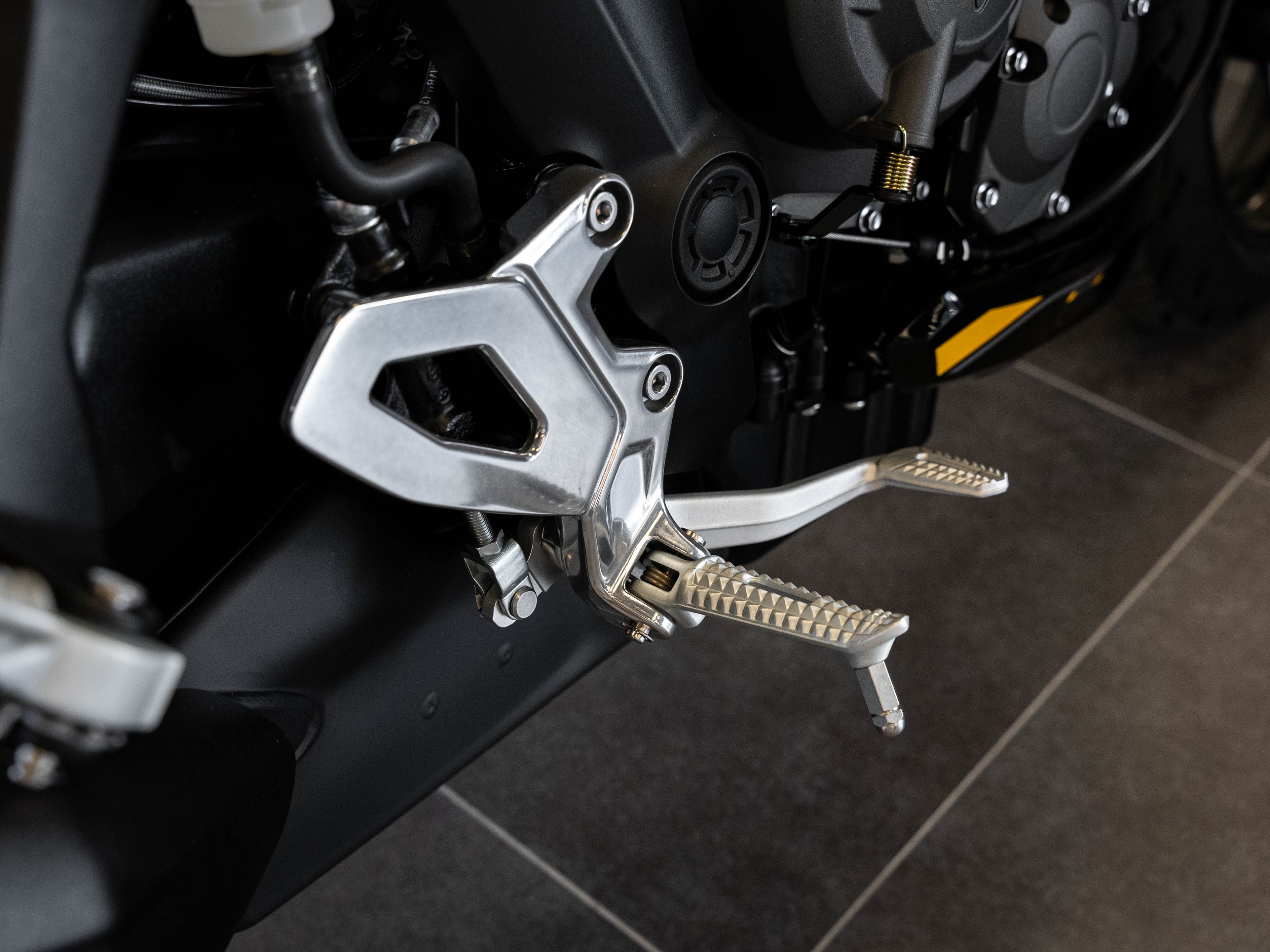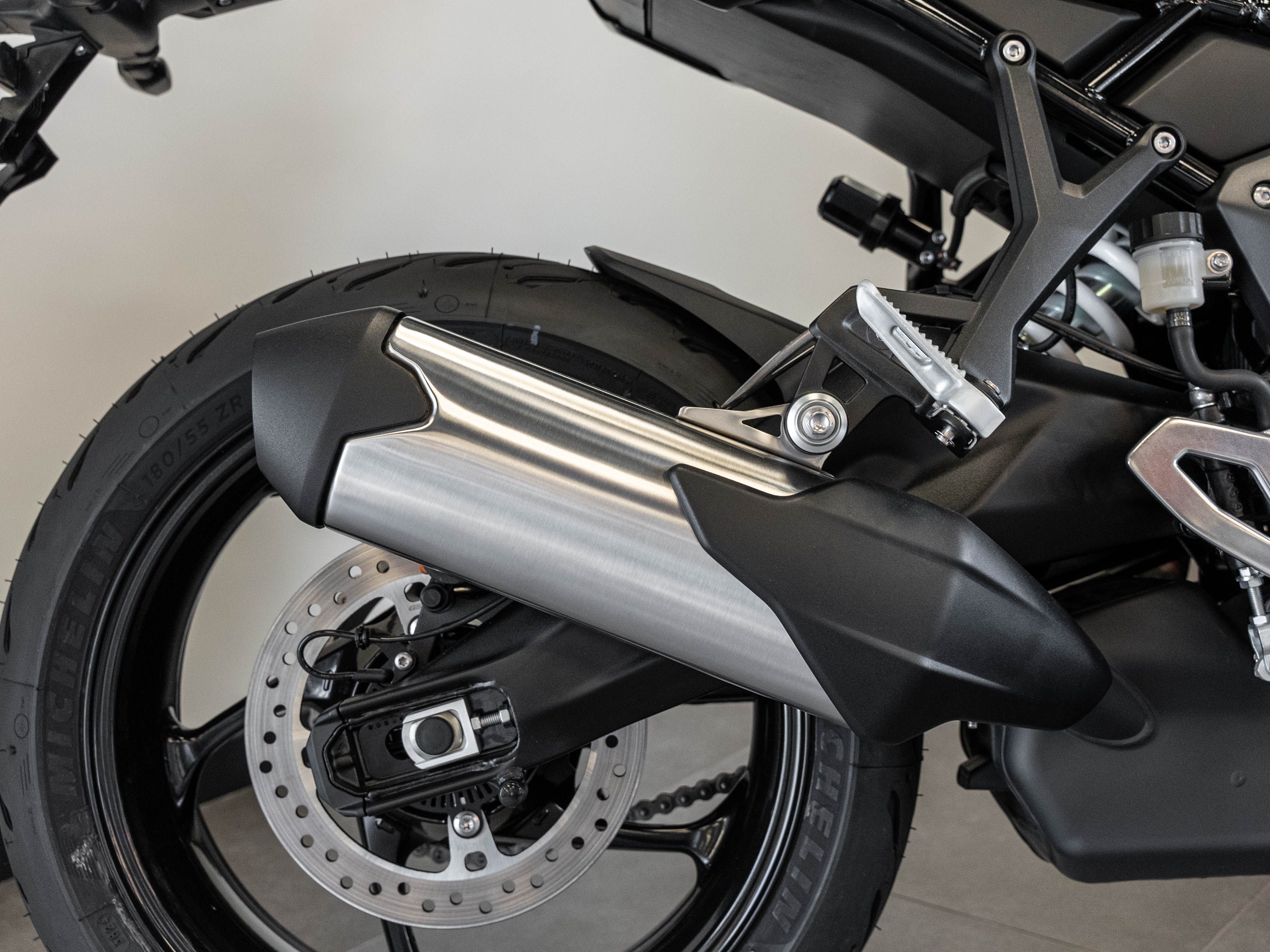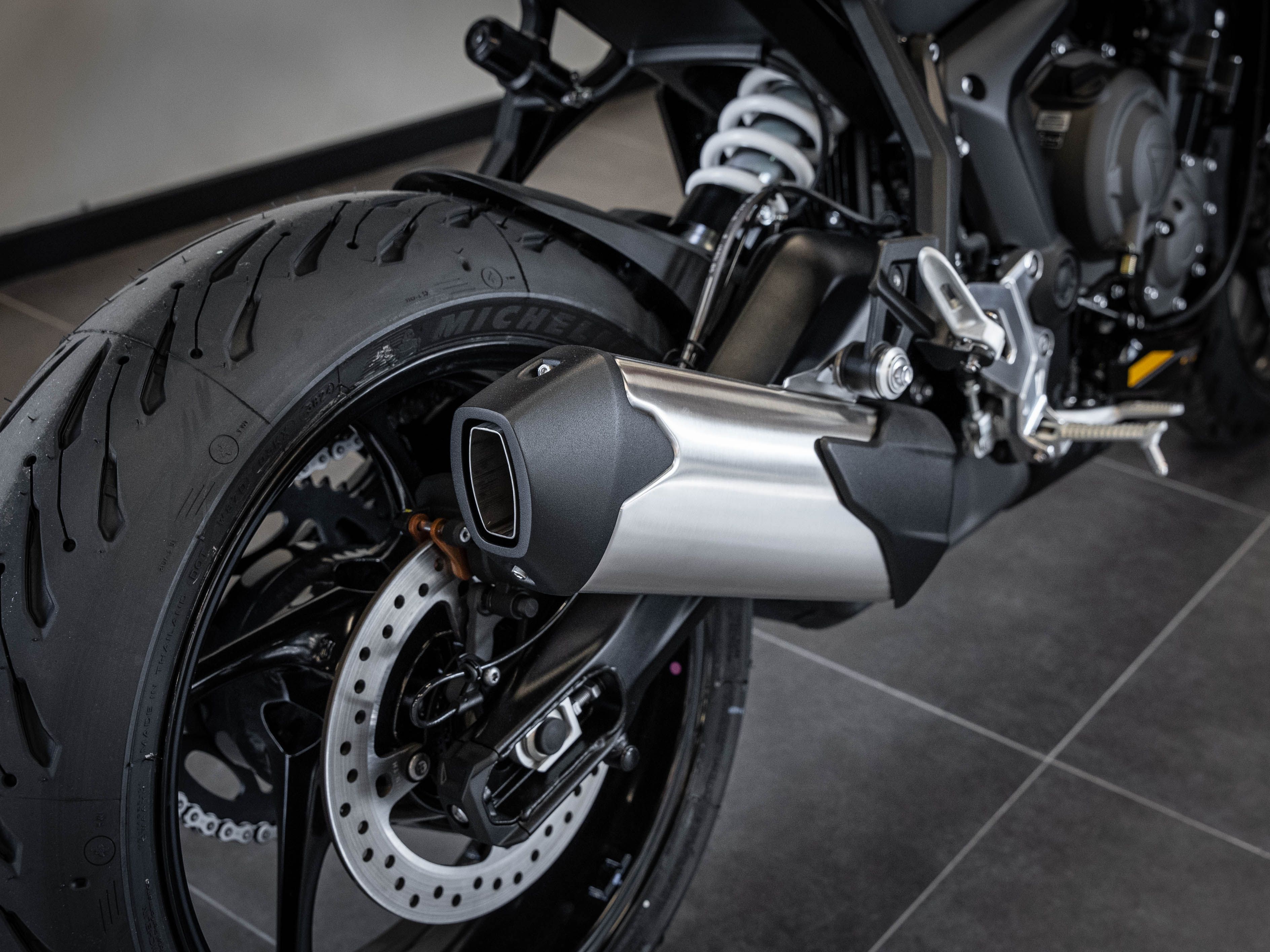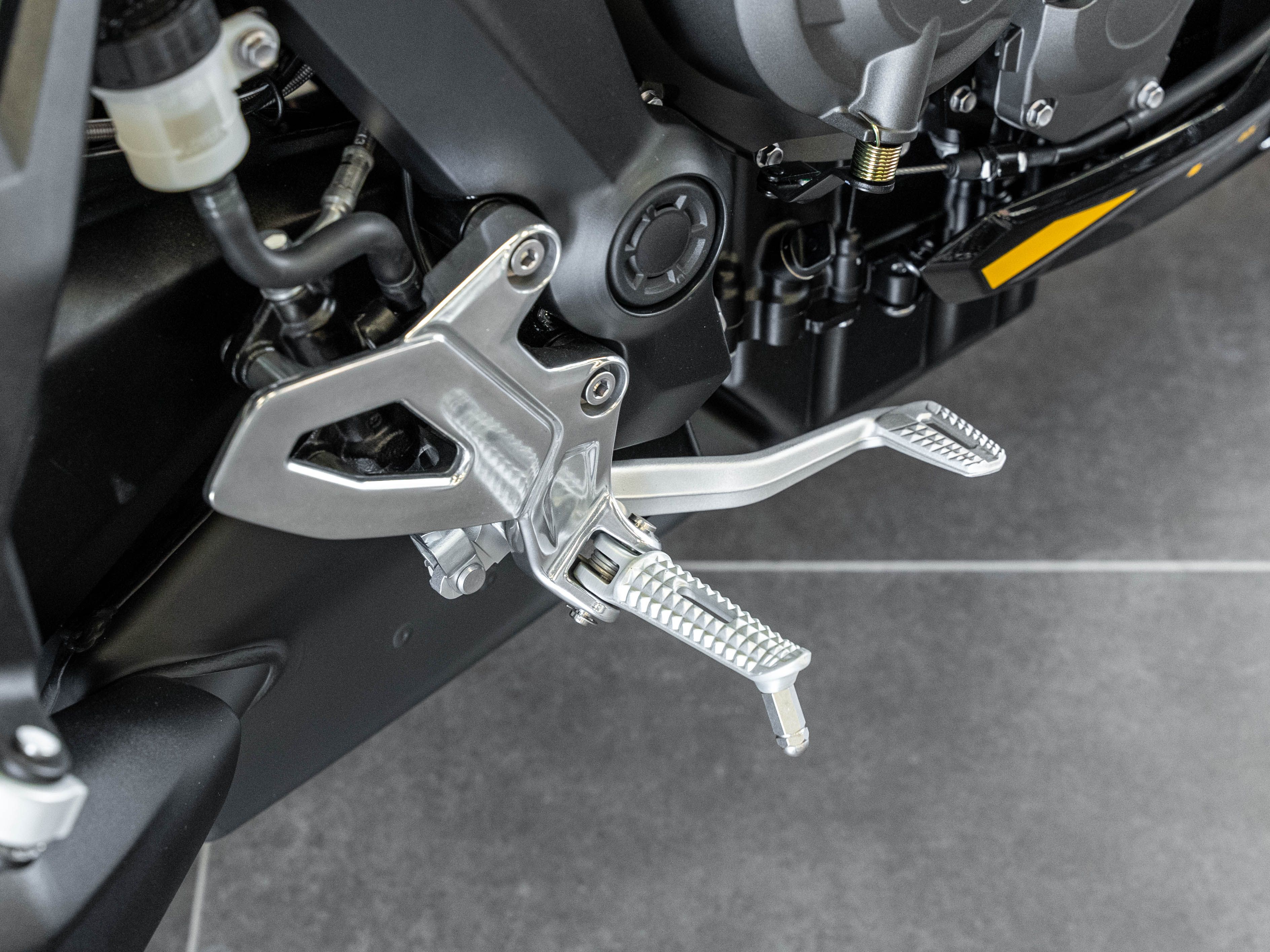 Suspension arrière : Mono-amortisseur Showa avec détente réglable et réglage de précharge hydraulique à distance, débattement de 150 mm.